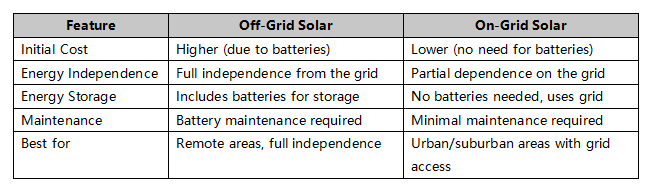 Both on-grid and off-grid solar systems have their benefits, but choosing the right one depends on your location, energy needs, and budget. Here’s a quick comparison: